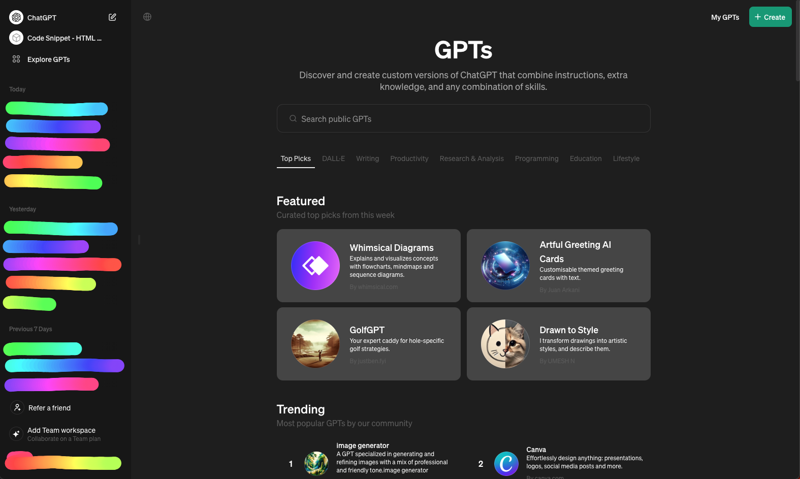 To get started, I clicked on “Explore GPTs” in the top left, which brought me over to a home menu screen where I could see other public GPTs that other engineers, companies, and builders had created for others to use.